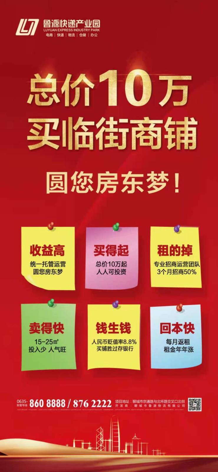 手有千万,不如金铺一间!鲁源快递产业园近期推出建面约15-25㎡独立产权小金铺,总价10万起,专业招商团队、统一托管运营,月月返租收益有保障,10年净赚一套小金铺,财富一马当先,买铺轻松、养铺不愁,圆您房东梦!
