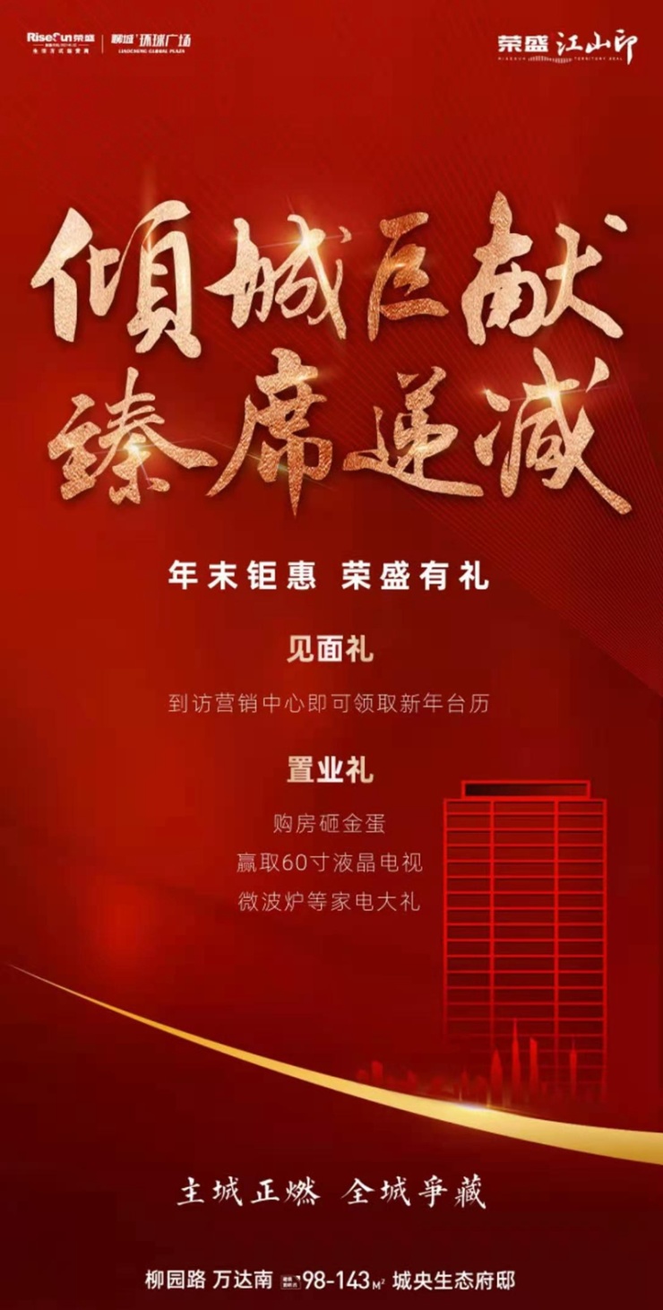 年末钜惠:年末钜惠,荣盛有礼:见面礼:到访营销中心即可领取新年台历;置业礼:购房砸金蛋,赢取60寸液晶电视、微波炉等家电大礼