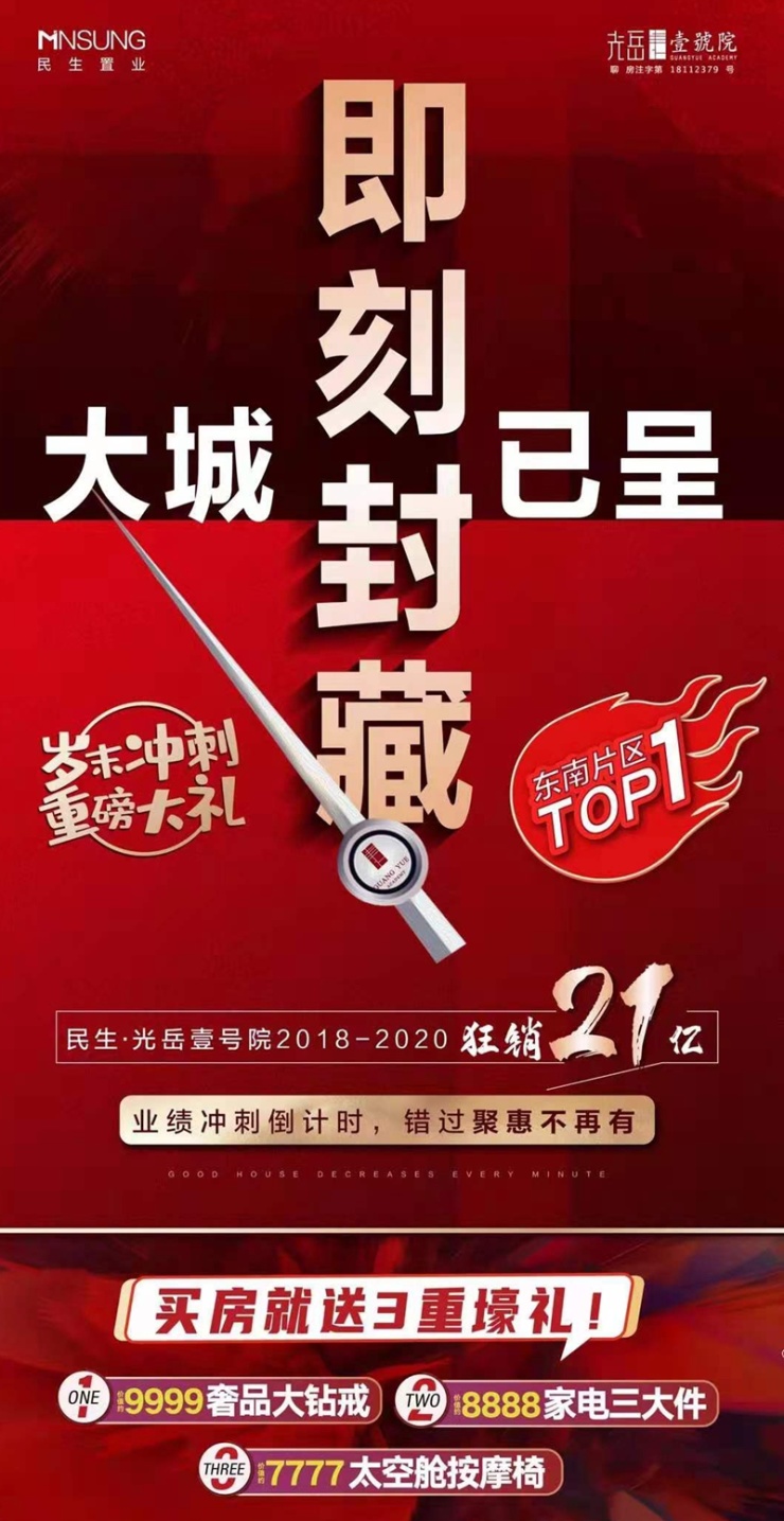 年末钜惠:业绩冲刺倒计时,买房送3重豪礼:价值约9999奢品大钻戒;价值约8888家电三大件;价值约7777太空舱按摩椅。