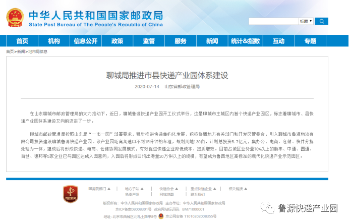 2020年7月14日山东邮政管理发布了关于《聊城局推进市县快递产业园体系建设》一文中表示: