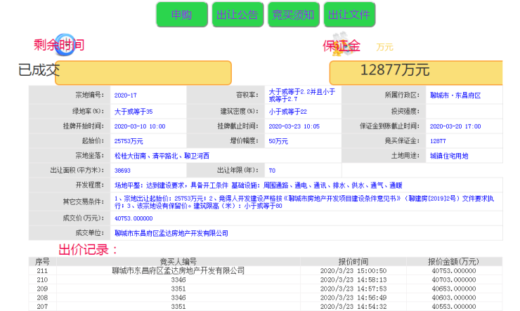 疫情之下,聊城土地市场的低迷态势,终于破冰,迎来春节后首次土拍。3月23日,主城区2宗经营性用地于聊城市公共资源交易中心网站公开竞价,总用地面积5.8404公顷。其中,备受关注的2020-17#宅地由东昌府区孟达房地产开发有限公司,以40753万元的价格摘牌,土地单价702.16万/亩;2019-113#商务金融用地由聊城绿亚商贸有限公司以6491万元的价格底价摘牌,土地单价219.54万/亩。
