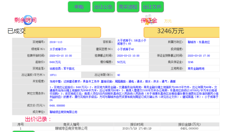 2019-113#商务金融用地,位于站前街西、军干路北,总占地面积19711㎡,合29.5665亩,容积率1.3≦X≦1.65,绿化率≧25%,起拍价为6491万元,起始单价219.54万元/亩,起始楼面价1995.81元/㎡。该地块由聊城绿亚商贸有限公司以6491万元的价格底价摘牌,土地单价219.54万/亩。